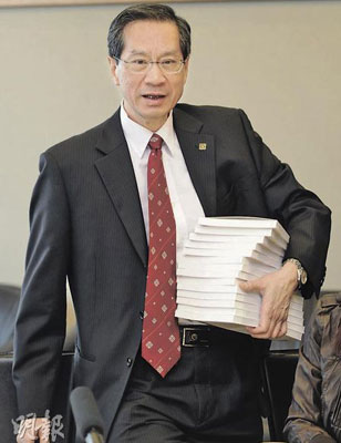 潘宗光准备了14本自己的新书,送给11日出席茶叙的记者。他原本不知有多少记者到场,故只是随便拿了一堆,当他发现在场恰恰好有14名记者,巧妙得令他笑不拢嘴。(图片来源:明报)