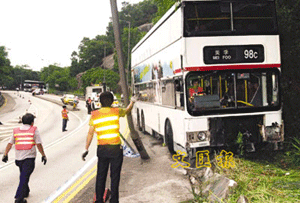 中新网9月19日电 据香港文汇报报道,香港一辆九巴18日晨在途中“死火”坏车,当车长协助乘客落车之际,巴士突然溜前,在无人驾驶之下连同4名未及落车乘客上演“生死时速”10多秒,沿斜路俯冲约百米,先后撞毁路边铁栏及灯柱始停下,铁支插入车底,车上乘客奇迹无恙。