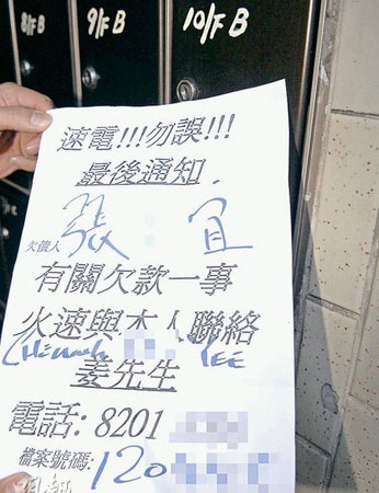 随后警员在两名死者楼下的信箱内发现一张追债通知书,内容有“速电!!!勿误!!!最后通知,有关欠债一事,火速与本人联络,姜先生,电话:8201xxxx。”等字眼,也有以蓝色箱头笔写上“张美宜”及档案号码等。