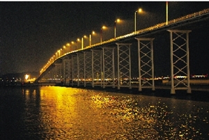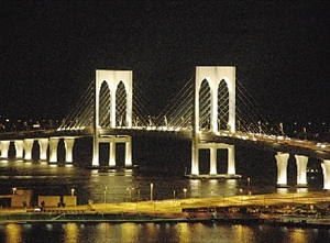 西湾大桥桥趸射灯未被盗去前,灯火通明。(图片来源:澳门日报)