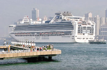 排水量超过11万吨的钻石公主号邮轮,14日载着逾3000名船员及旅客抵港。由于船只体积太大,不能靠近海运码头,只能在西环对外海面停泊,旅客要乘接驳船只,乘船到中环港外线码头上岸。旅发局特别派出职员在码头接待,在码头设置咨询及服务专柜,向旅客派发欢迎礼包。
