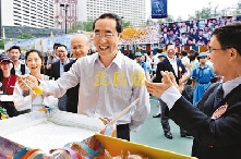 唐英年参加卖物会,呼吁市民踊跃做善事。图片来源:文汇报