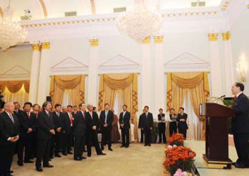 曾荫权3日在礼宾府主持新春酒会。他开始致辞时先和一众来宾开个玩笑:“今日已经是年初九,不过‘有心不怕迟’……听说今年拜年有一个禁忌,就是不能祝贺别人‘财源滚滚’,因为‘裁员’是大家近期最担心、最不愿意听到的事。”不过,曾荫权这个“开场白”,正好为他讲金融海啸作了引子。