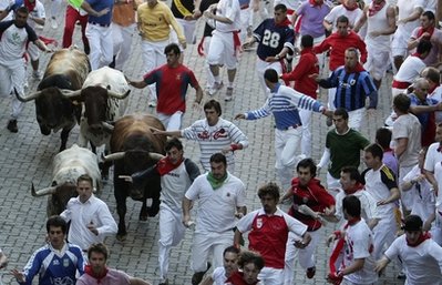 在他们的后面,狂奔的是6头好斗的公牛与6头戴着铃铛的公牛。它们要奔跑850米,从候宰栏跑到城市北部的斗牛场。