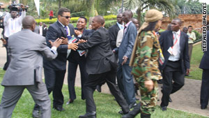 乌干达总统旅发言人艾基森魏思加(音译)表示:“两次冲突都是因利比亚方面缺乏尊重导致的。”记者纳塔尔透露,卡扎菲非常生气,甚至掌掴了他的卫队成员。