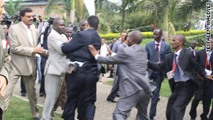 峰会第一天,利比亚总统卫队即与乌干达安全人员发生了拳脚冲突。根据CNN记者萨曼森纳塔尔的描述,当时正要举行峰会开幕式。按照规定,只有国家首脑被允许进入会场。利比亚总统卫队试图护送卡扎菲通过入口,遂与乌干达安全人员发生争论,随后升级为肢体冲突,但是双方没有动枪。