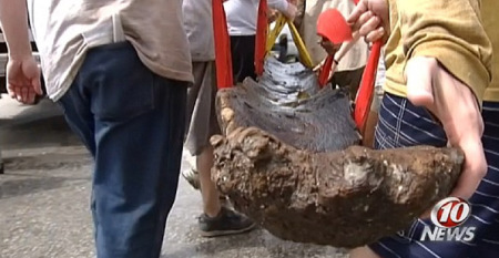 为了保护这只千年的独木舟不受损坏,发掘时工作人员先用锯将其分成几部分,待运到陆地上之后再将其清洗干净,存放在一个装有水和化学溶液的缸中保存起来。