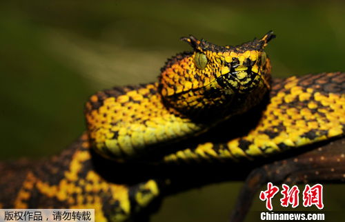 中新网1月12日电 综合媒体12日报道,野生动物保护协会近日在坦桑尼亚的丛林中发现一只新品种的毒蛇。这条毒蛇黄黑皮鳞相间,眼睛为暗绿色,并拥有两个尖尖的角。这条毒蛇名为“玛蒂尔达角蝰”。
