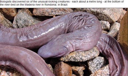 桑托·安东尼奥能源公司(Santo Antonio Energy)的工程师在马德拉河修建一座水利大坝时,在河床底部发现6条看起来十分怪异的生物,它们每条约1米长,被命名为atretochoana eiselti。尽管它们看起来有点儿让人恶心,但对科学家来说,这却是令人激动的发现。尽管它们看起来像蛇,但实际上却可能是火蜥蜴和青蛙的近亲。这种盲蛇1968年曾被发现,十分罕见。
