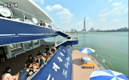 据悉,“大同江”号长68.98米、宽26米、排水量820吨,具备一次能容纳300人的两层餐厅。