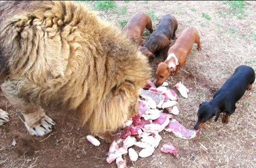 据报道,狮子行动不便,因为它的骨头有问题,所以走起路来是一跛一跛的,腊肠狗和另外两只狗狗Bullet和Angel,似乎能意识到它身体上的残缺,于是便担任起安抚、保护的角色。重达227公斤的狮子平常会和狗狗一起玩耍,还会一起用餐。