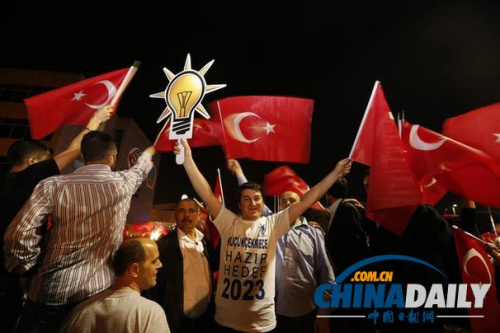 支持者在机场挥舞旗帜等待埃尔多安总理