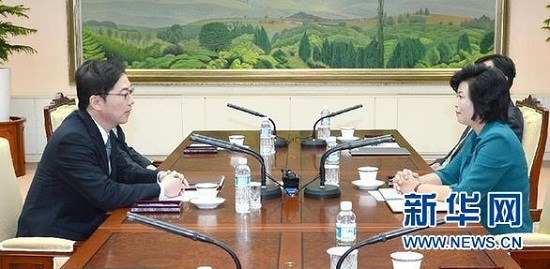 6月9日,在板门店韩国“和平之家”,朝鲜代表团代表金圣惠(右)与韩方代表团千海成(左)进行实务性会谈。 新华社发(韩国统一部提供)