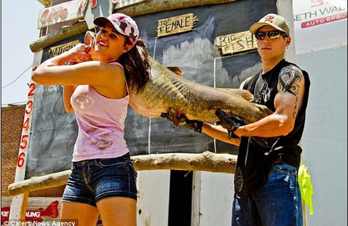 美国一名19岁女子徒手钓出32公斤巨型鲶鱼(图)