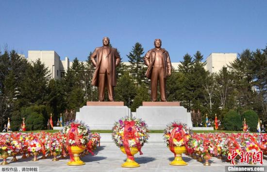 资料图:当地时间2013年4月14日,朝鲜平壤,朝鲜在人民保安部树立已故领导人金日成和金正日的铜像,并举行了揭幕仪式。