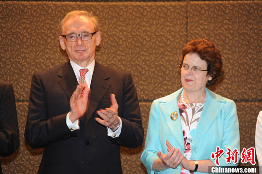 7月30日,澳大利亚驻成都总领馆开馆。图为澳大利亚外长鲍勃·卡尔(左)同澳大利亚驻华大使孙芳安(右)出席开馆仪式。中新社发 张浪 摄