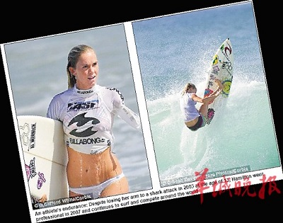 《每日邮报》19日报道,现年23岁的美国夏威夷女孩贝萨妮•汉密尔顿2003年在冲浪时不幸被鲨鱼咬掉一条胳膊,然而身残志坚的她非但没有被击垮,在受伤仅3周后就又开始继续从事她热爱的冲浪运动,重返冲浪赛场。过去几年来中,汉密尔顿经常在世界各地进行巡回演讲,用她自强不息的勇敢精神鼓舞了成千上万人,而她的经历也在2011年被拍成了电影《灵魂冲浪》。