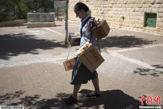 资料图:当地时间8月26日,以色列民众在防毒面具分发处领取用品,以防范叙利亚战火波及。