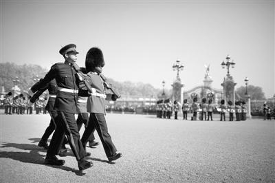 2011年4月20日,伦敦,白金汉宫卫兵进行换班。