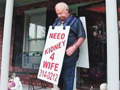 来自南卡罗来那州,今年78岁的斯威林(Larry Swilling)花了一年功夫,背着牌子在南卡罗来纳街头行走,央求陌生人捐肾救助他的病弱老妻。现在他终于心愿得偿,找到条件匹配的捐肾人,如果一切顺利,本月12日就可进行换肾手术。