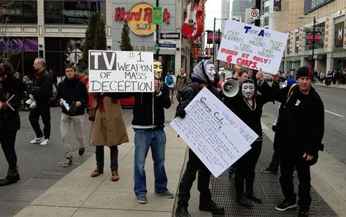 在美国,抗议者们挥舞着巨大标语,谴责美国主流新闻媒体。加州标语上写着“联合抵制媒体”,堪萨斯市抗议者戴着“匿名者”面具,宣称“美国人有权知道真相”。美国民众抗议媒体报道有限的主题包括2010年日本福岛核事故。一名抗议者称:“核辐射正接近和影响我们,不只是加州,全世界都受影响。它会如何影响我们的饮用水、食物供应乃至生活方式?”