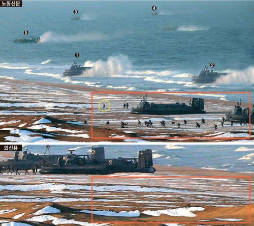 报道称,疑似合成的部分是登陆后气垫船区域(红色方框)。虽然上下两张照片为同一拍摄地,但可以发现两张照片里拍摄的地形却不同。上面一张照片中,红色方框内的人民军(黄色圆圈)后面基本看不到雪,但下面一张照片的相同位置却有一段约2米长的雪路向右侧长长地延伸出去。