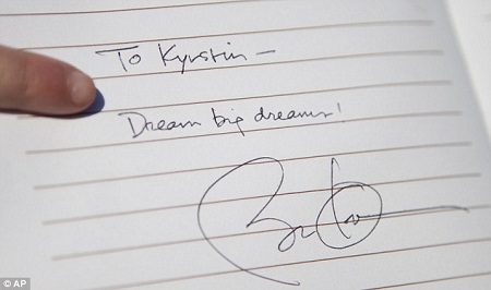 奥巴马写道,“致基斯汀——梦想着伟大之梦!”(To Kyrstin - Dream big dreams!)最后还附上自己的签名。