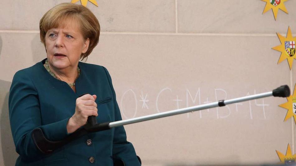 德国总理默克尔在瑞士滑雪受伤后一直拄拐出席各种活动