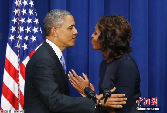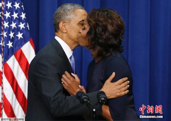 中新网1月17日电 据美国媒体报道,美国总统奥巴马与夫人米歇尔16日在一次公开场合上当众亲吻,试图破除此前有关两人不和的传闻。