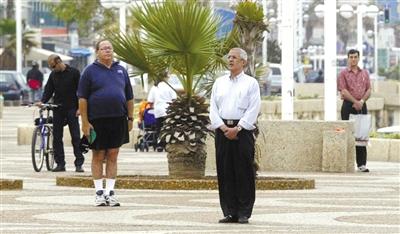 2004年4月19日,耶路撒冷,汽笛声中行人原地站立默哀。