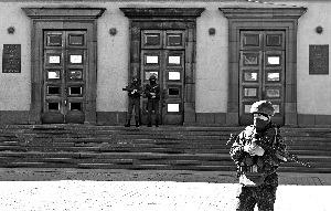 数日来,武装部队控制克里米亚多个机场。在距离克里米亚首府辛菲罗波尔大约30公里的佩列瓦涅镇,乌克兰第36海岸警卫旅营地2日被一支部队包围。乌克兰军方发言人说,对方有大约1000人和20辆汽车,他们发出“最后通牒”,命令乌军放下武器并打开营门,但是遭到拒绝。