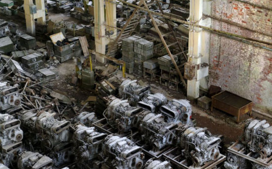 被遗弃:尽管守卫森严,但伊特金最终设法潜入这个巨大的坦克墓地,拍摄了许多废旧坦克和发动机照片。图中,大量旧坦克发动机和其他器械被随意放在地板上等待腐烂。