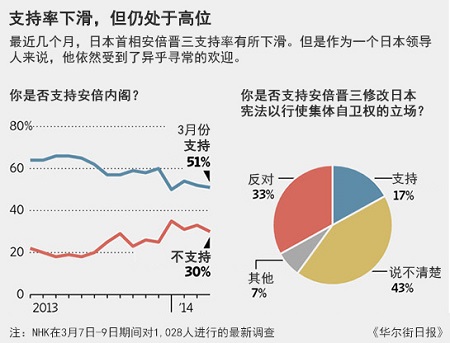 与此同时,安倍晋三执政第二年的标志性事件包括与中国和韩国的紧张关系升级,以及受到了奥巴马政府几乎毫不掩饰的批评。去年12月末,安倍晋三参拜靖国神社。报道指出,与中国和韩国的紧张关系升级正是安倍这一举动带来的“意料之中”的风险。