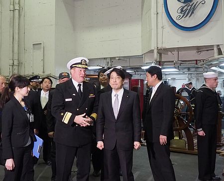 据报道,小野寺是在下午抵达横须贺市的美国海军基地的。他在驻日美军海军司令克拉夫特的陪同下,参观了“乔治•华盛顿”号,并视察了主要的内部设施。