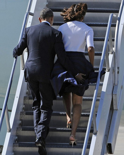 4月10日,奥巴马和米歇尔准备登上空军一号,奥巴马用手捂住了米歇尔被风吹起的裙子,避免了尴尬的出现。网页截图