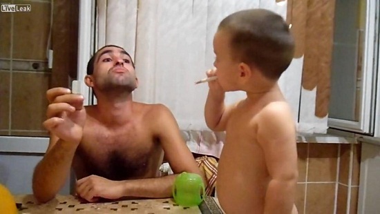 中新网4月25日电 据美国媒体24日报道,俄罗斯一名父亲教自己仅有两三岁的儿子吸烟,这段视频一经上传到网上,就引起了网友怒斥。