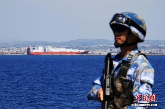 当地时间4月22日下午,经过中、俄、丹、挪舰艇编队历时6小时35分的联合护航,负责运输叙利亚化学武器的丹麦、挪威运输船先后安全驶出叙领海。至此,中国海军黄山舰顺利完成第十七批叙化武海运护航任务。图为化武运输船进港时,特战队员执行警戒任务。中新社发 李建红 摄