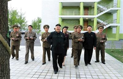 4月30日,朝鲜最高领导人金正恩视察新建的平壤纺织厂宿舍,被授予朝鲜人民军次帅军衔的黄炳誓(右一)首次亮相随行。