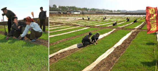朝鲜举国动员插秧保粮供 文宣队田间鼓劲(图)