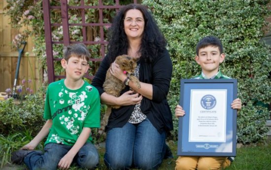 主人雅基(中)抱着世界最老的宠物猫波佩,旁边是雅基的两个孩子,所持证书是吉尼斯世界纪录认证。