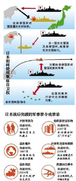 军事科学院外国军事部研究员袁杨说,解禁集体自卫权对日本战后军事力量发展有跨时代意义,意味着日本能够以“关系密切”、“友好”的国家遭受攻击为名义,主动参与一些军事行动。比如日本可以帮美国“反击”第三方的“进攻”。解禁集体自卫权可以使日本发展军事力量摆脱诸多限制。袁杨说,以前,自卫队武器装备发展受到一些具体限制,比如不能有进攻性武器,导弹射程较短。解禁集体自卫权后,“日本军事力量可能会慢慢有所发展”。