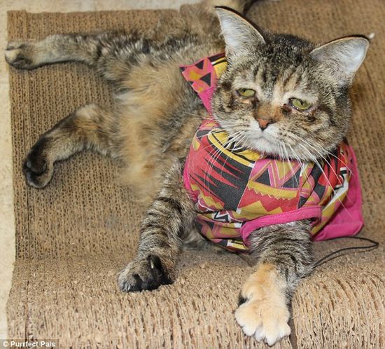 华盛顿宠物领养中心的职员说图克“非常可爱、讨人喜欢”,但其皮肤比一般猫咪薄,很容易受损及掉毛,故要穿小衣服保护。