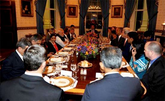 美国副总统拜登、美国国务卿克里、印度外交部长斯瓦拉吉陪同在座,双方各有20名官员出席。但奥巴马的夫人米歇尔没有出席晚宴。
