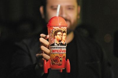 当地时间25日,洛杉矶,在电影院等待观看《采访》午夜场的民众,手持印有该片剧照的饮料杯。