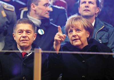 默克尔与绍尔在柏林墙倒塌25周年的纪念活动上交谈。