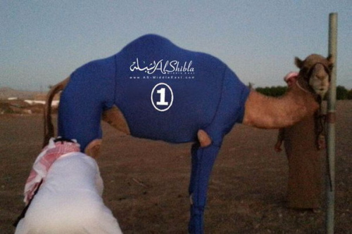 中东商家为骆驼穿莱卡外套,称可助其跑更快。(网页截图)