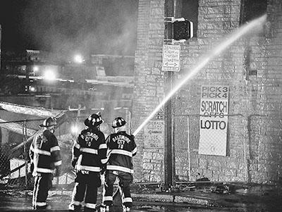 巴尔的摩连日来的抗议示威最终演变成暴力打、砸、抢、烧行为。图为消防队员在被焚烧的建筑前灭火。