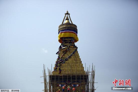 当地时间2015年5月27日,尼泊尔加德满都,工人修复在地震中损坏的博拿佛塔。
