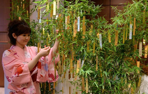 在日本,织女不但要赐给孩子们巧手,还要负责满足各种愿望。每年这个时候,大人和孩子都会聚在一起,在五颜六色的长条诗笺上写下愿望和诗歌,连同用纸做的装饰品一起挂在自家院内的小竹子上。此外还要在院子里摆上玉米、梨等供品,以此请求织女星保佑自家女孩的书法、裁衣等手艺能有所进步。