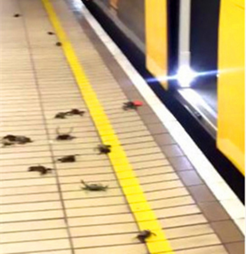 中新网9月22日电 综合外媒报道,英国盖茨黑德市的一个地铁站日前出现一幕颇为违和的场景:一群大闸蟹在站台上“横行霸道”,脚步匆匆如同在赶车,画面太美乘客们几乎“不敢看”。